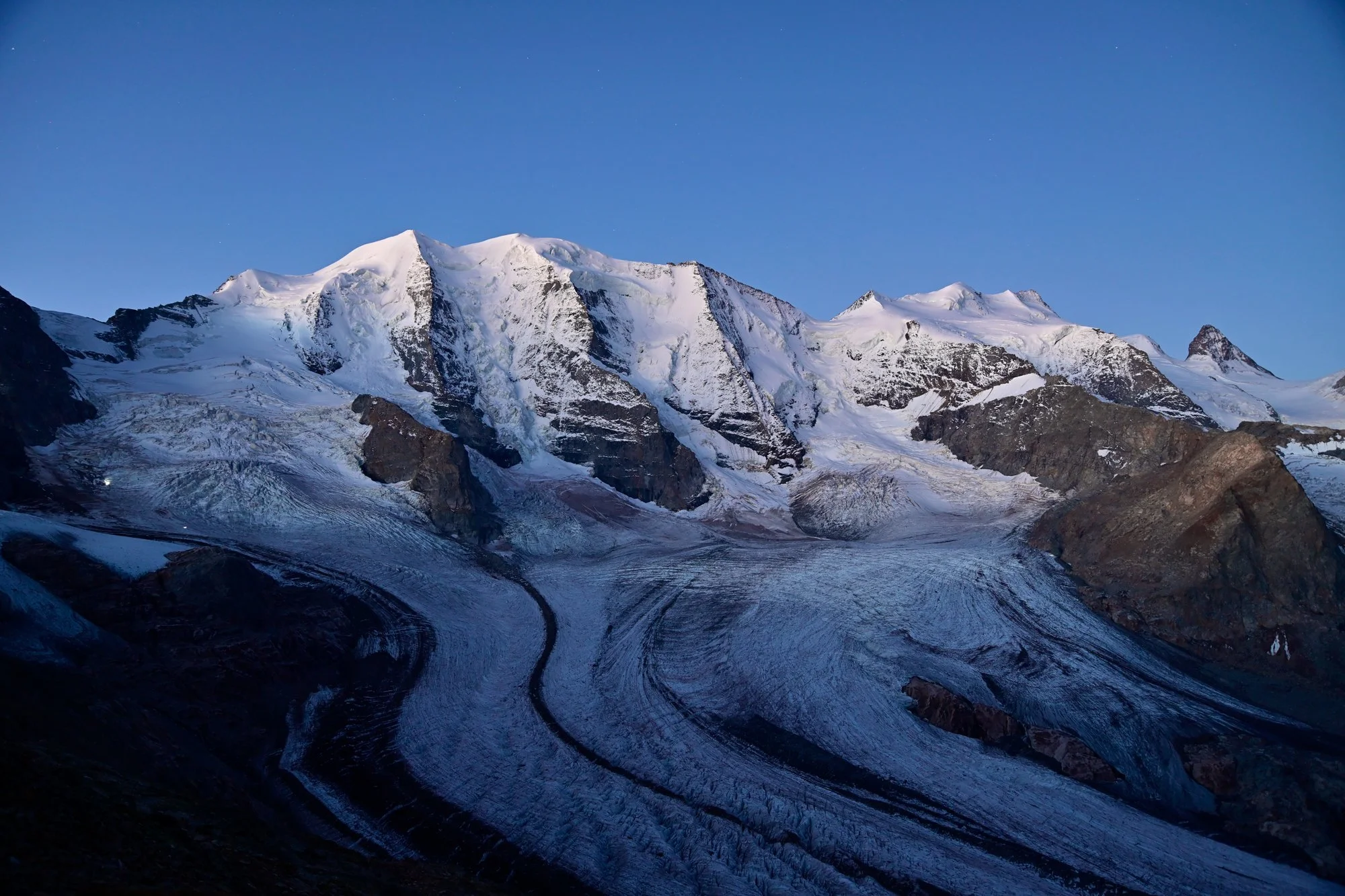 Glaciers.today is Jürg's most personal long-term project. Since 2023, high-resolution cameras installed at over 3,000 metres on the Diavolezza capture the Pers Glacier, Piz Palü, and Piz Bernina every thirty minutes — day and night, summer and winter. Over 30,000 images. No selection, no filter. The camera shows what is.