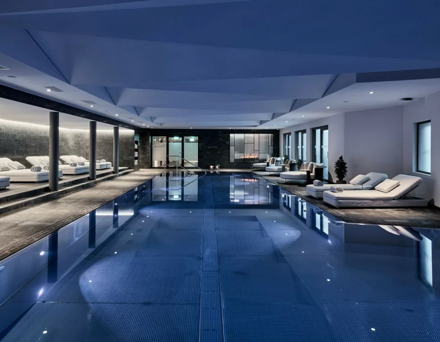 A 20-metre thermal pool, Finnish and bio-salt saunas, steam bath, and treatments by myBlend and Aesop — designed for deep restoration after a day in the mountains.